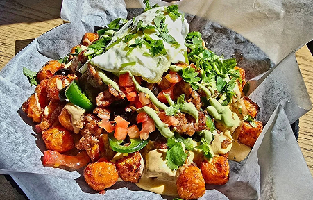 Golden Fried Sweet Potato Tots Covered With Queso Blanco, Bacon Crumbles, Sliced Fresh Jalapenos, Local Made Breakfast Sausage, Diced Tomato, Avacado Creme, Fried Local Egg Cooked To Order, Cilantro.