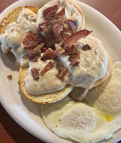 certified angus beef steak covered in gravy made with our housemade wild boar chorizo, fresh sage, bacon. served with two local eggs cooked to order, sourdough toast, and hash browns or cottage cheese.
