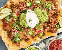 house-made tortilla chips covered in melted cheese, fresh pico de gallo, sliced black olives, sliced jalapenos, sour cream and fresh guacamole.