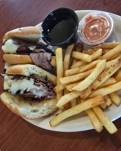 sliced brisket on a toasted baguette. served with a side of au jus.