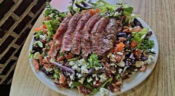 mixed greens, diced tomatoes, bacon, grilled ribeye steak, and bleu cheese crumbles. served with bleu cheese dressing